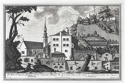 | Ansicht der St. Johannes-Kirche am Kapuzinerberg mit umgebenden Häusern und Lederbearbeitung | |