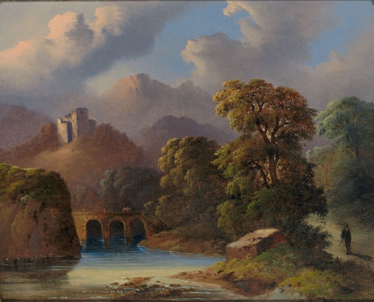 | Südliche Alpenlandschaft mit steinerner Bogenbrücke, Burg und Figurenstaffage an einem sonnigen Sommertag | |