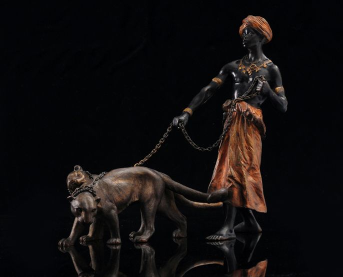 Figure of a Nubian hunter with a pair of leopards on a chain