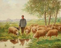 Berger et moutons à l´abreuvoir.