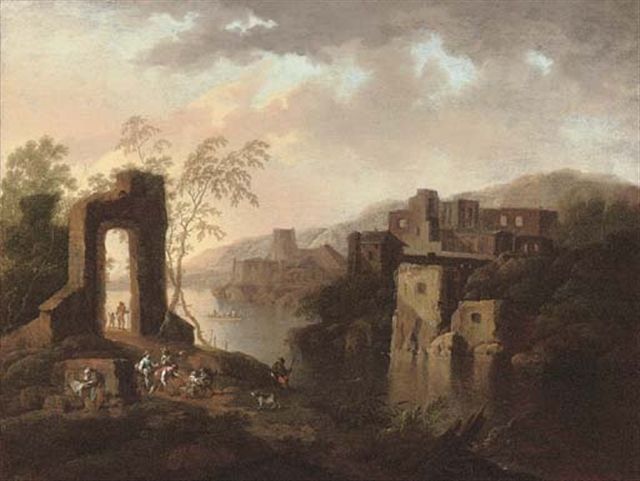 A river landscape with travellers on a track by ruins