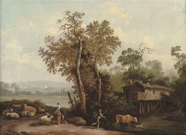 | A wooded river landscape with a shepherd and shepherdess with their flock and cattle | |