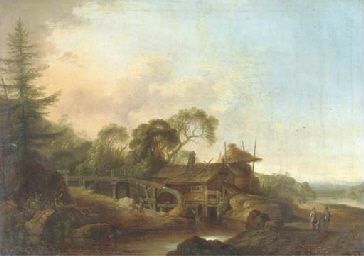 | A wooded river landscape with a watermill, figures conversing on a path nearby | |