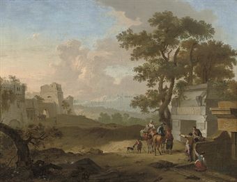 | An Italianate landscape with travellers conversing outside a classical tomb, mountains beyond | |