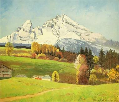 | Weite Vorfrühlingslandschaft mit Gehöft vor schneebedeckten Hochgebirge | |