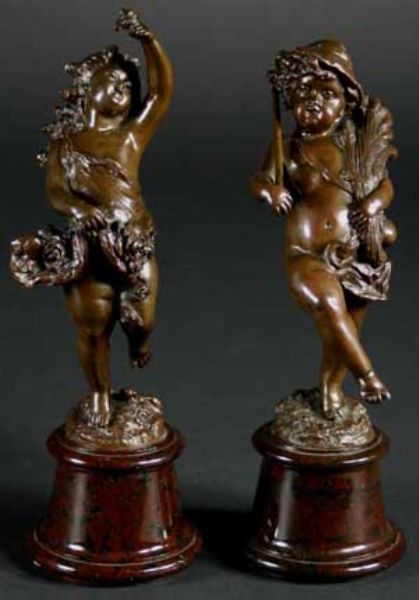 A Pair of 19th Century Bronze Statuettes; a boy carrying wheat and a girl with flowers