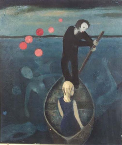 Paar bei der Fahrt in einem Nachen über einen See mit Gestalten
