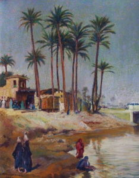 Verhüllte Frauen am Waschplatz in Palmenlandschaft