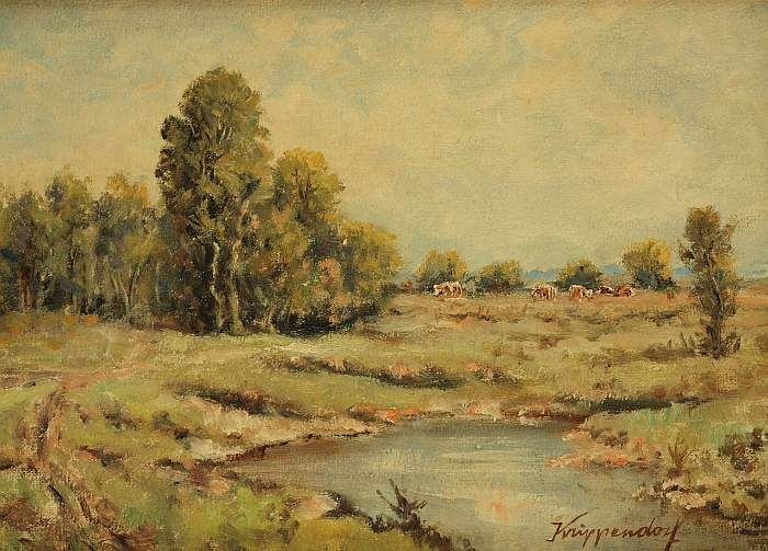 Grasende Kühe in weiter Landschaft vor einem Weiher