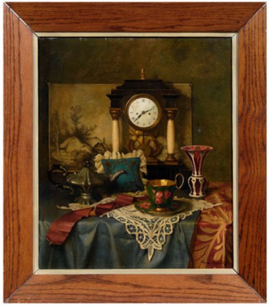 | Still life with shelf clock, teapot, cup and saucer, glass vase on a fabric-strewn table | |