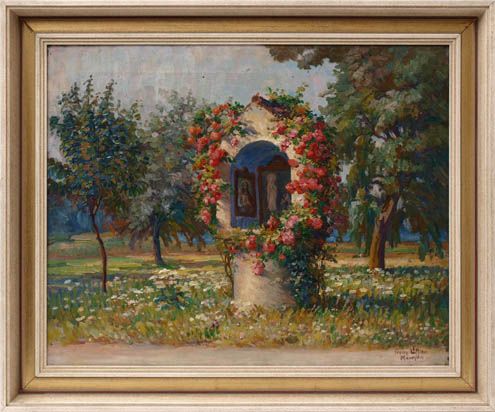 Rosenumwachsenes Marterl mit zwei Heiligenbildern auf blumenübersähter Wiese vor einem kleinen Wäldchen