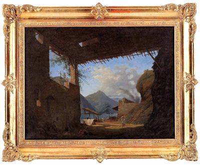 | Überdachte Ruine an einem Felsvorsprung mit Blick auf einen oberitalienischen See mit Figurenstaffage | |