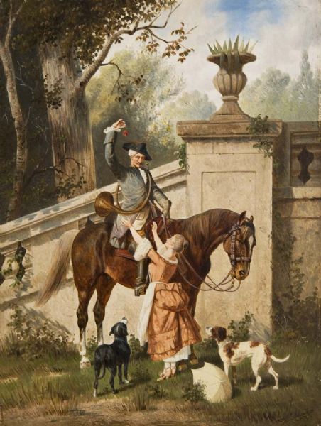 Piquer zu Pferde, einem Mädchen eine Rose zuwerfend