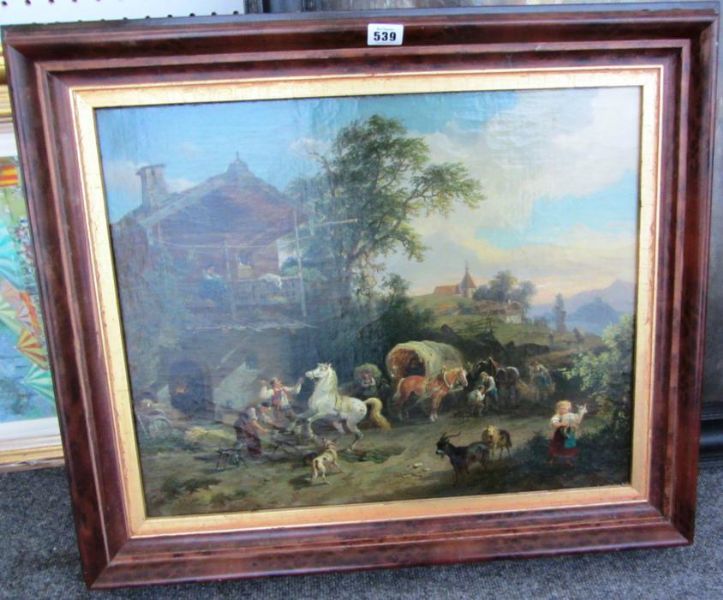 Figures, horses, goats and other animal in a village