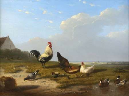 CATTLE, SHEEP AND HENS IN A LANDSCAPE