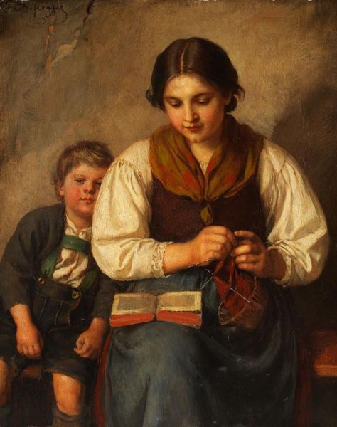 Strickende Bäuerin mit Buben