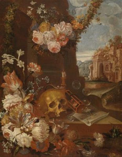 | A vanitas still life with flowers, a skull, an hourglass, soap bubbles and ruins | |