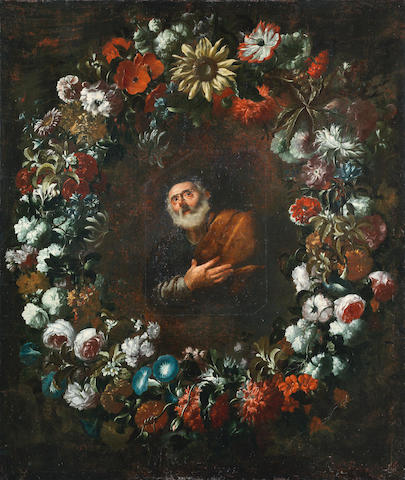 | A garland of flowers with carnations, roses and a sunflower, with an added central cartouche depicting the Penitent Saint Peter | |
