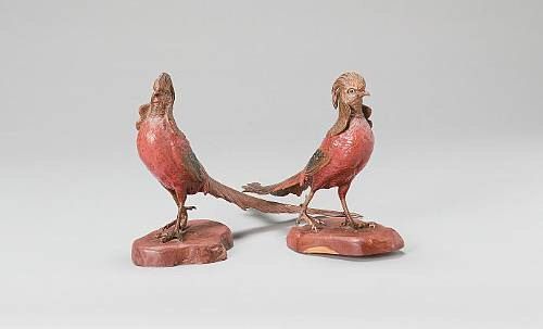 A pair of cold painted bronze models of pheasants on later wooden bases