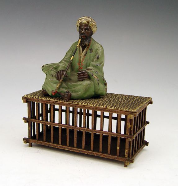 BERGMAN AUSTRIAN BRONZE ORIENTALIST FIGURE MAN SEATED ON CAGE