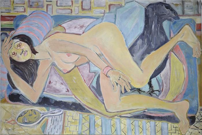 Auf Sofa liegender Frauenakt.