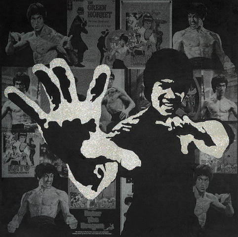 | Screenprint phosphorescent screen print flocked with glitter on black velvet mounted onto white paper | |