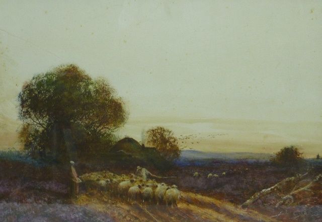 Evening, Near Parton, Kent, a shepherd and flock with a girl watching