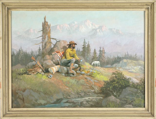Cowboy brewing coffee over a fire in the Rockies