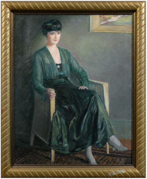 | portrait of lady seated in chair and wearing green dress and hat, 1930s | |