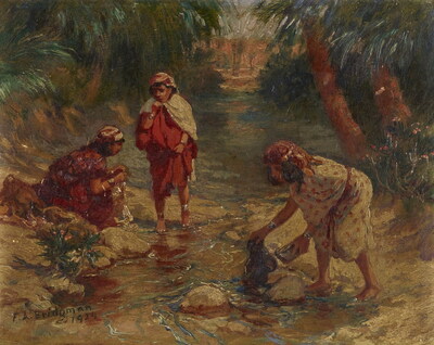 Arthur BRIDGMAN (1847-1928) - Jeunes filles au bord de l'Oued - Huile sur panneau signée et datée 1924 en bas à gauche - 19 x 24 cm | |