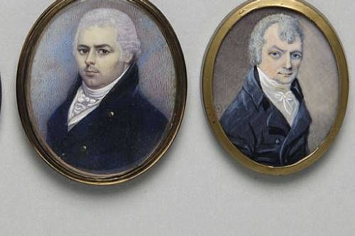 A young gentleman having powdered hair and wearing a blue coat, spotted waistcoat and white cravat
