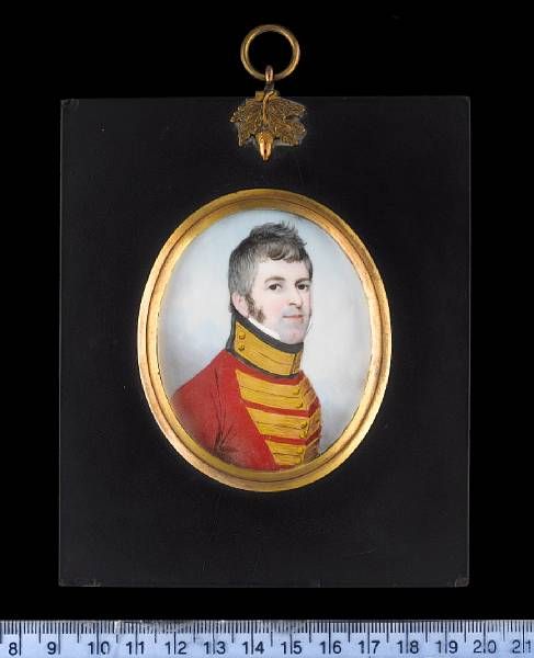 An Officer, wearing scarlet coatee with black collar and gold braid.