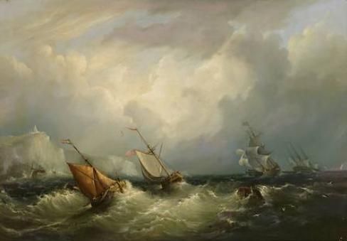 | Britische und holländische Schiffe in stürmischer See vor Steilküste. | |