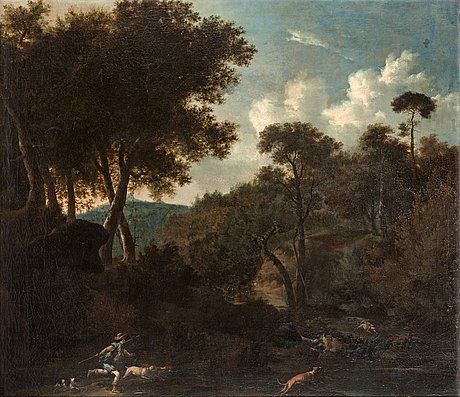 | Landscape with hunters, dogs and deers. | |