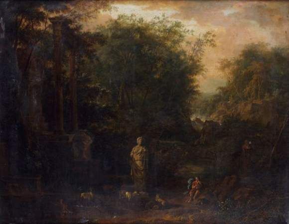 | Paysage boisé avec un berger jouant de la flûte près d'une statue antique et de ruines romaines, vasque, portique et tombeau | |