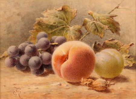 Still Life Study of Grapes, Peach and Greengage on a Bank