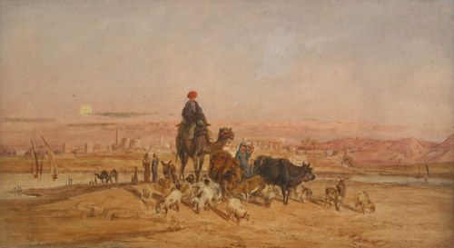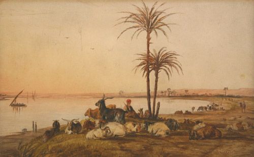 | View of the River Nile with Figures wearing Traditional Costume amongst Goats, and Figure on a Camel amongst Oxen and Goats, a T | |