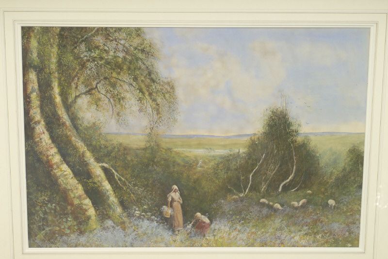 | Two Girls Picking Bluebells in the Foreground with Sheep Grazing Nearby and an Extensive Landscape Beyond | |