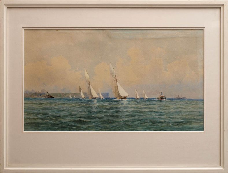 Segelregatta vor der Küste mit drei begleitenden Dampfbooten auf ruhiger See unter sonnigem Himmel