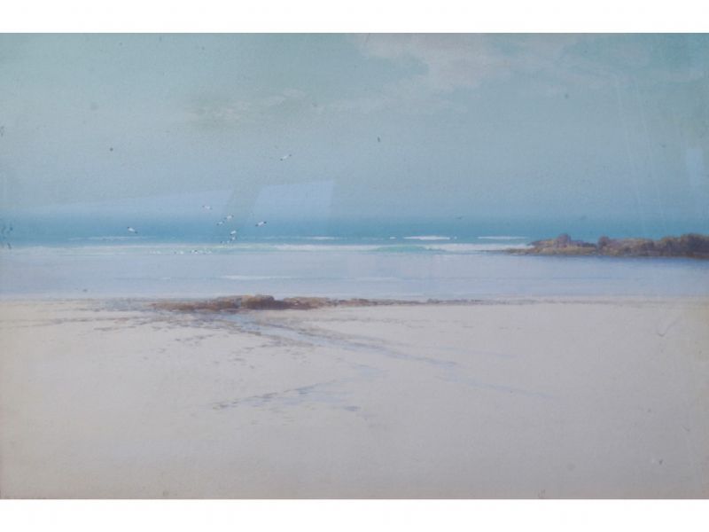View across a beach towards a serene sea, with seagulls