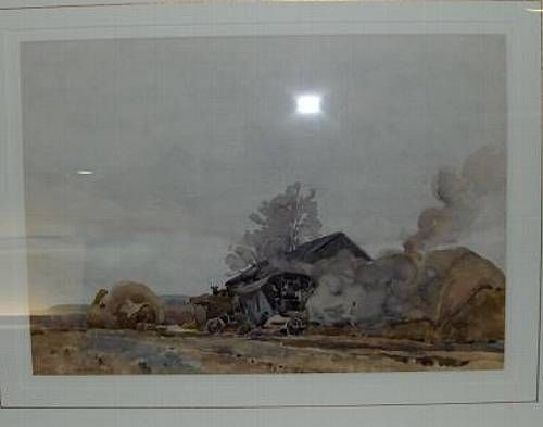 Landscape with threshing machine in a barn