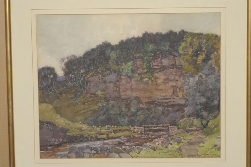 | Wharfedale landscape with sheep beside a bridge | |