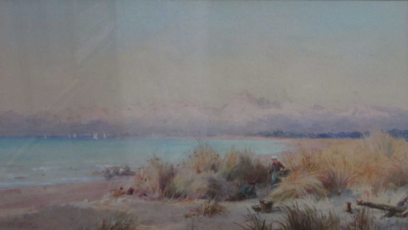 Figures on a beach and amongst dunes before a mountainous backdrop