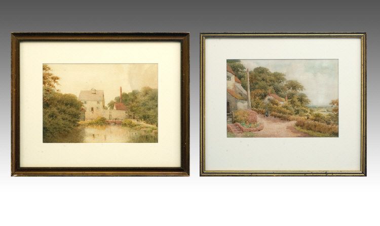 | 1. Man & Woman Chatting In A Country Lane Near Cottages Signed, Verso Label, "Effingham Surrey", 2. A Mill Pond With People On A | |