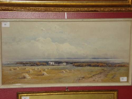 | 'Caerlaverock, Dumfries', landscape with cornstooks and castle | |