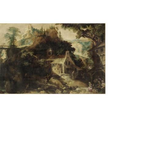 | A MOUNTAINOUS RIVER LANDSCAPE WITH A CHAPEL AND A TAVERN, WITH FISHERMEN NEARBY | |