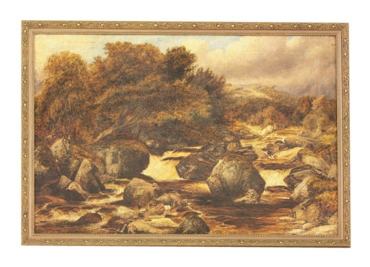 A ROCKY RIVER LANDSCAPE WITH AN ANGLER