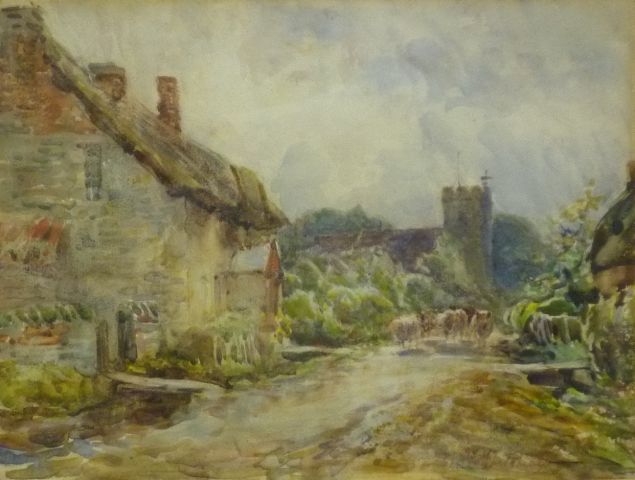 Cattle on a Village Street with Church in the Distance