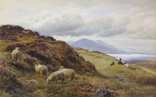 | Highland Landscape with Sheep near Shepherds and a Dog, a Loch beyond | |