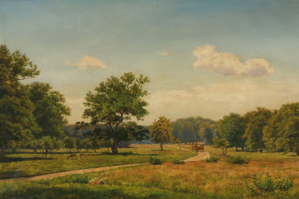 Danish summerlandscape from Jægersborg Dyrehave with deer and carriage